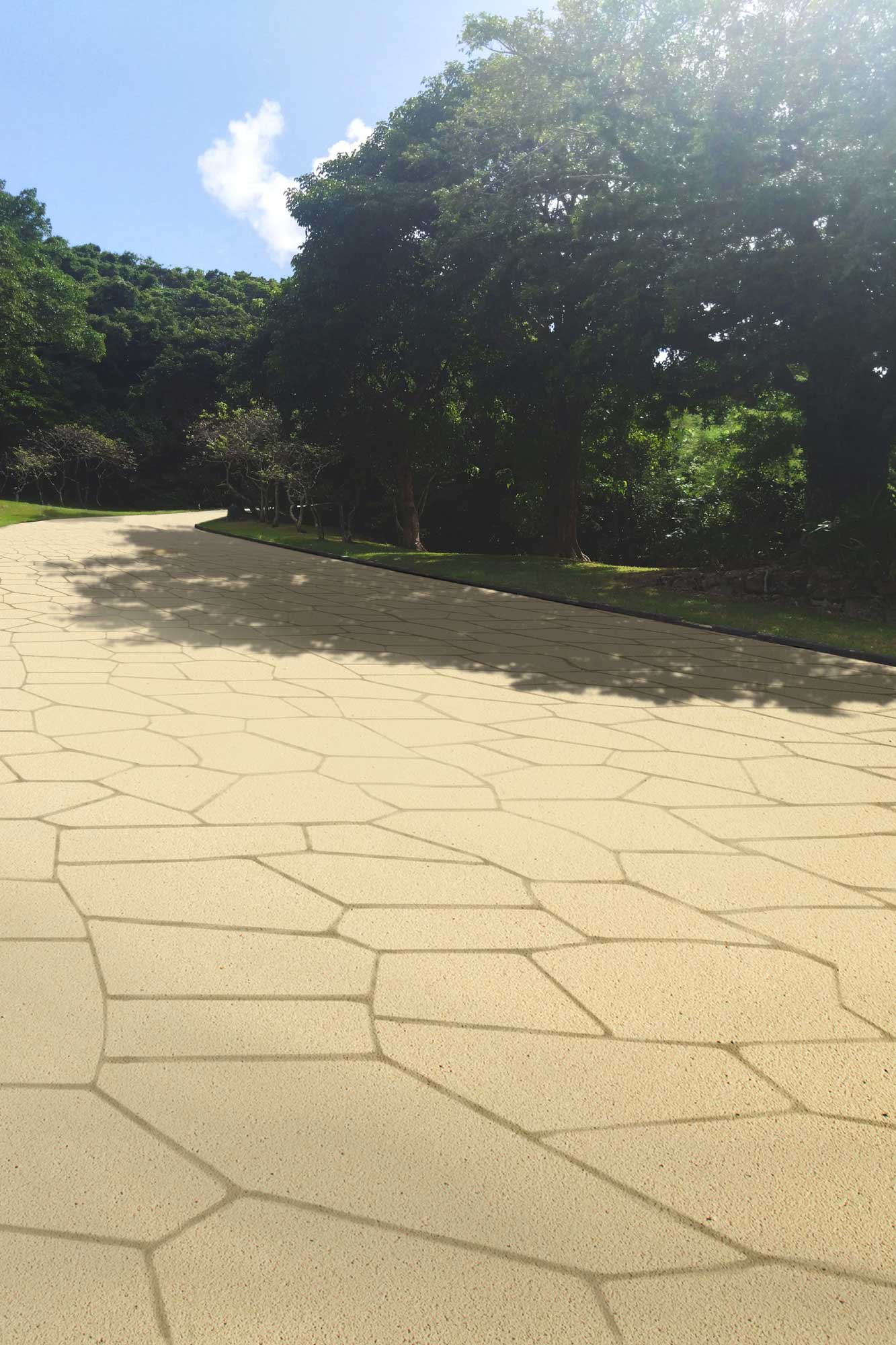 素材に琉球石灰岩を使用する「琉球」は、雑菌処理済み琉球石灰岩と水性樹脂系混和剤を練り混ぜた特殊土をアスファルトやコンクリートの表層へ均一に塗布するだけの薄層舗装です。